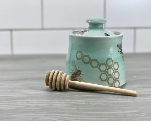 Grolleg porcelain honey pot. Glazed in my aquamarine glaze. Fired to cone 10 in oxidation. Adorned in honeycomb and bees. With 6" wooden honey dipper.